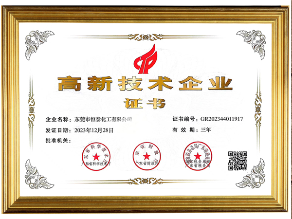 热烈祝贺东莞市恒泰化工有限公司被认定为“高新技术企业”,经过20多年的发展与沉淀,恒泰化工累积